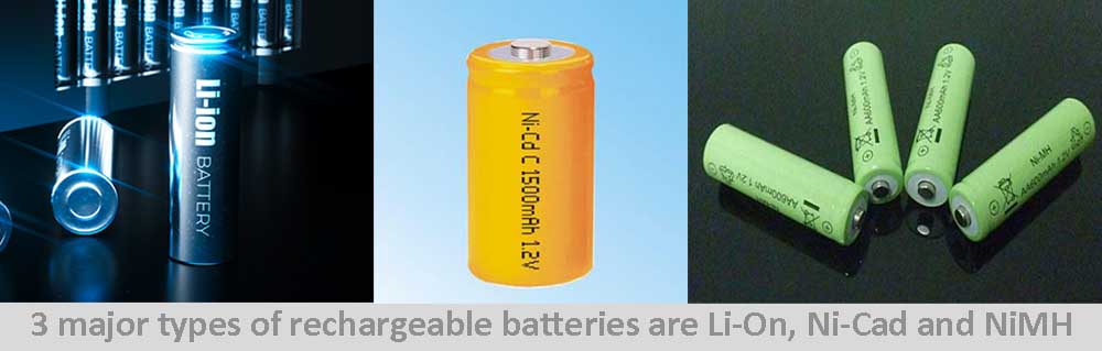三种主要类型的可充电电池是Li-On、Ni-Cad和NiMH。虽然Nicd可以充电1000-2000次,NiMh可以充电500-1500次,但锂离子电池的循环寿命高达4000次。