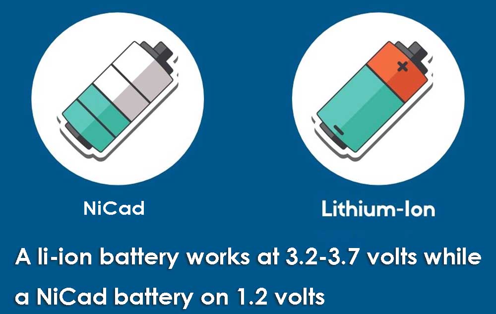 锂离子电池工作电压为3.2-3.7伏,而镍镉电池工作电压则为1.2伏。